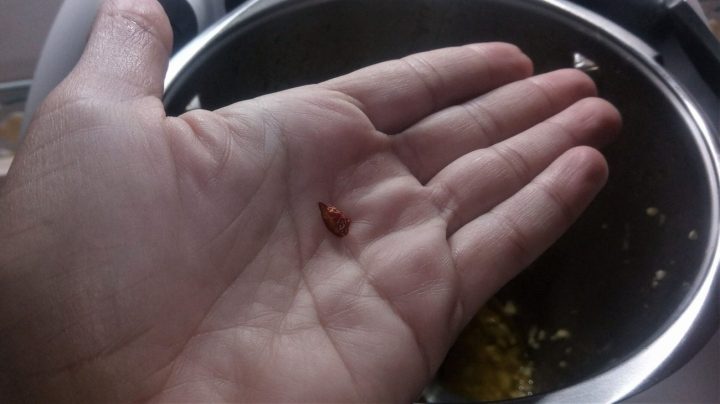 - Añade el trocito de cayena al vaso y programa 10 minutos, temperatura Varoma, velocidad cuchara, sin colocar el cubilete para permitir que los aromas se concentren.
