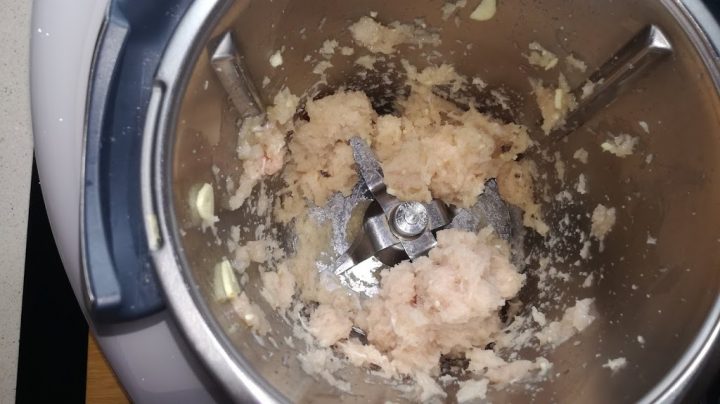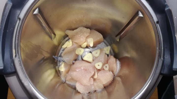 - Triturar el pollo: Introduce en el vaso de la Thermomix la pechuga de pollo troceada, el ajo y una pizca de sal. Programa 5 segundos a velocidad 7 hasta que quede bien picado.