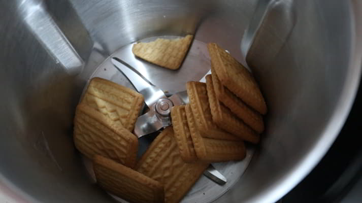 - Lo primero que vamos a hacer va a ser pulverizar las galletas, para ello echamos unas 20 galletas María y le damos un golpe de turbo, dependiendo del grosor que nos guste le podemos dar otro golpe para que nos queden mejor pulverizada.