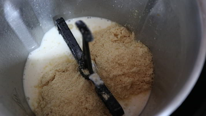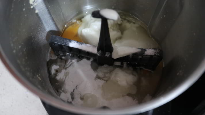 - A continuación ponemos la mariposa y echamos los huevos, el aceite, el yogur, el azúcar, el sobre de levadura y programamos 1 minuto a velocidad 4.